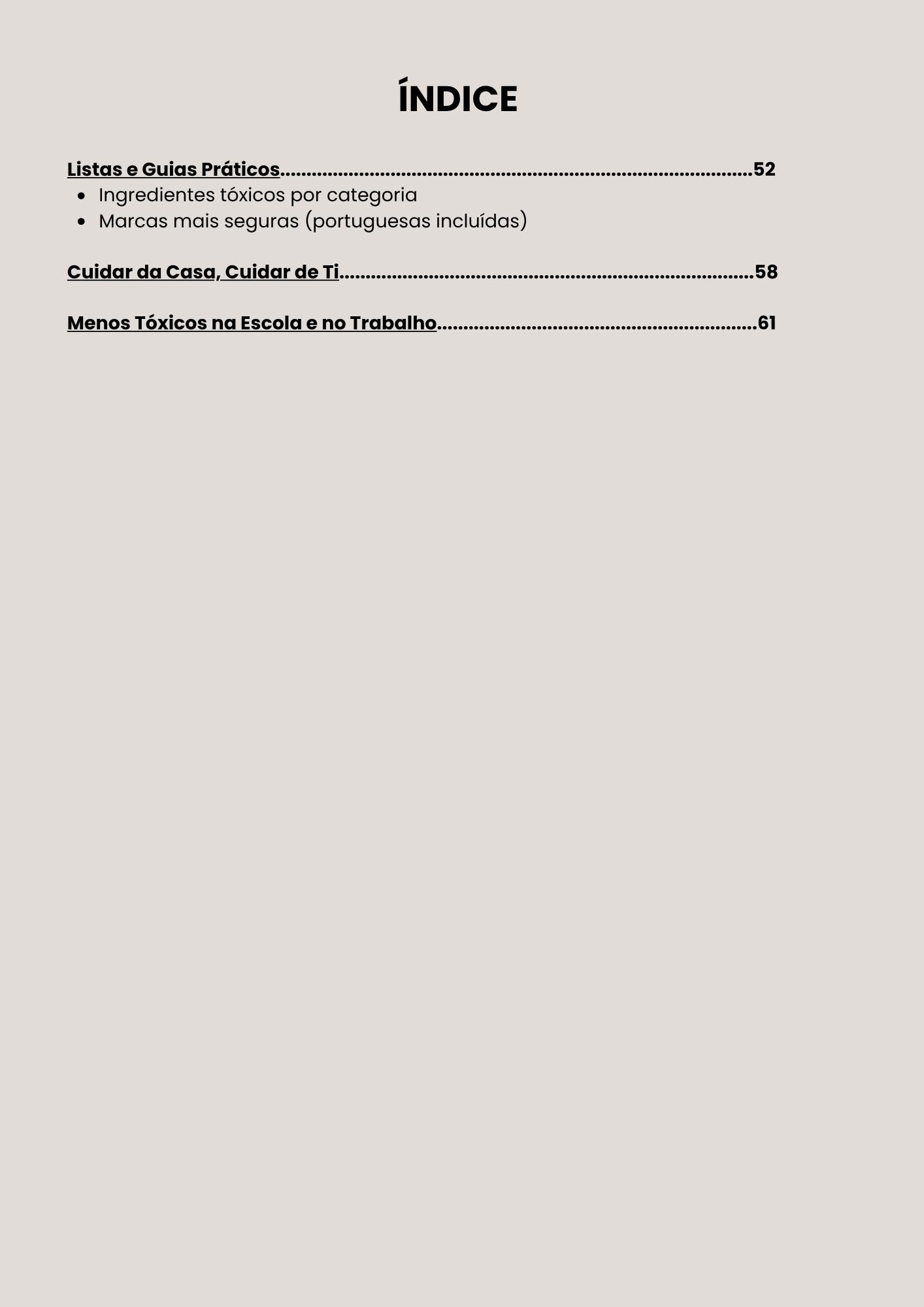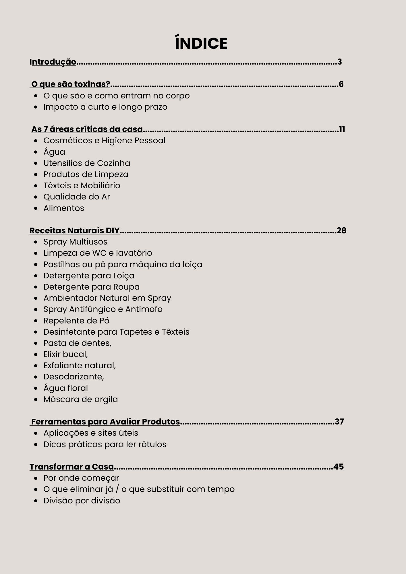 O livro aborda as 7 áreas mais críticas da casa onde os tóxicos costumam esconder-se — e mostra-te como substituí-los com alternativas naturais e seguras. Vais aprender a fazer os teus próprios produtos de limpeza, como sprays multiusos, detergente de roupa, ambientador natural, pastilhas para a máquina da loiça e muito mais. E também produtos de autocuidado como pasta de dentes, elixir bucal, exfoliante, desodorizante ou máscara de argila — tudo com ingredientes simples e acessíveis.